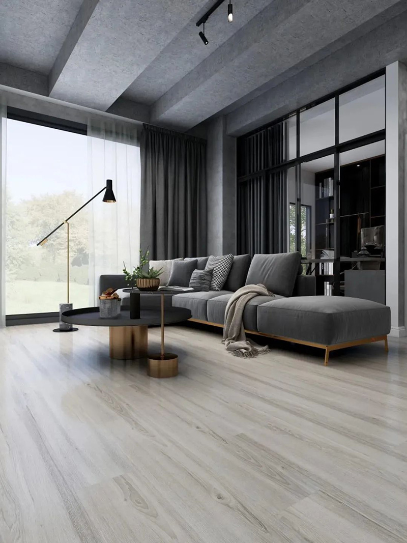 在很多时尚的年轻人的家中,选择高级灰呈现一个家的面貌,是一种非常新颖的做法,灰色系地板时尚低调,突破木色调刻板的限制,又让空间曲线更柔和,质感更舒适。